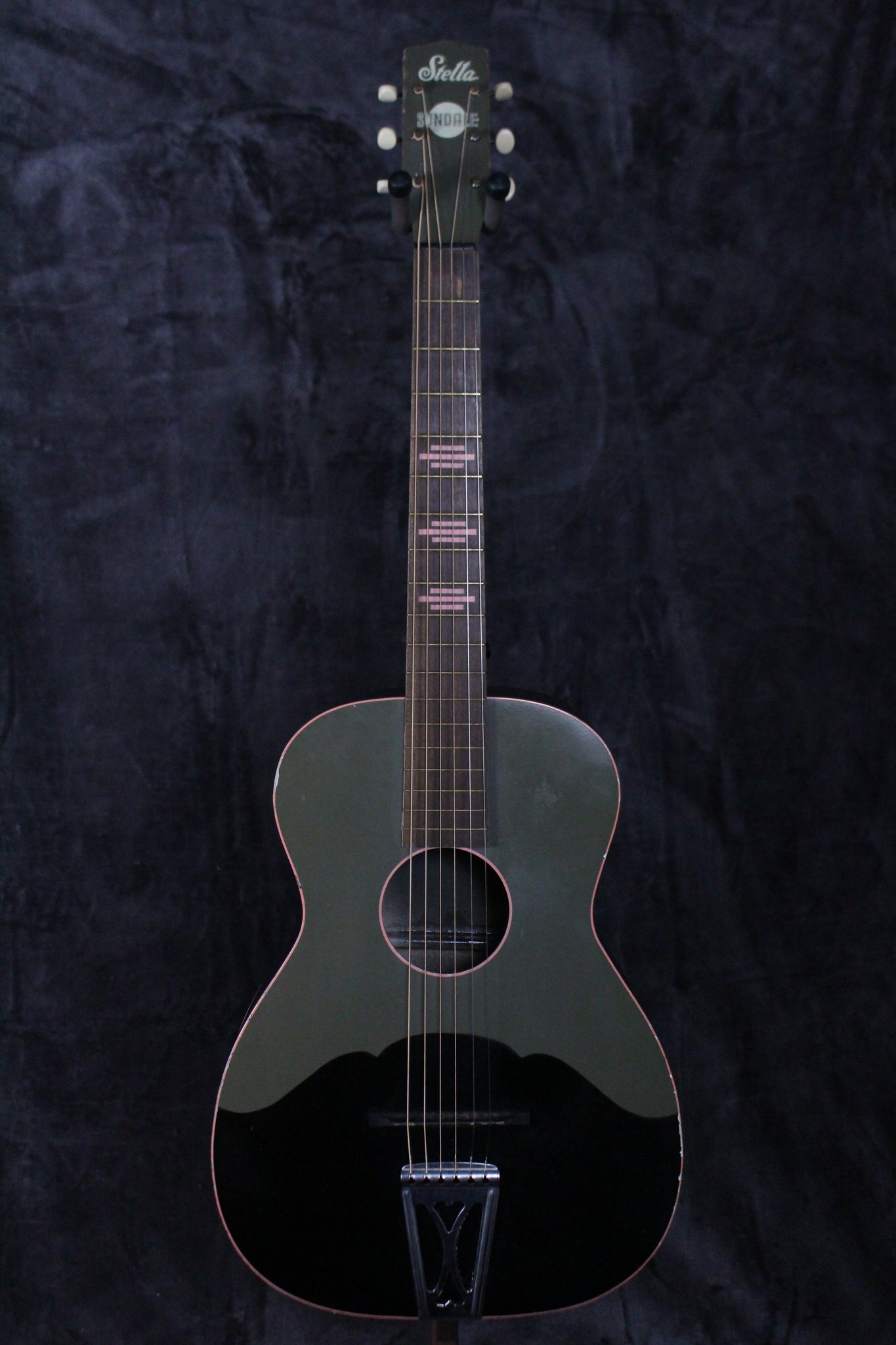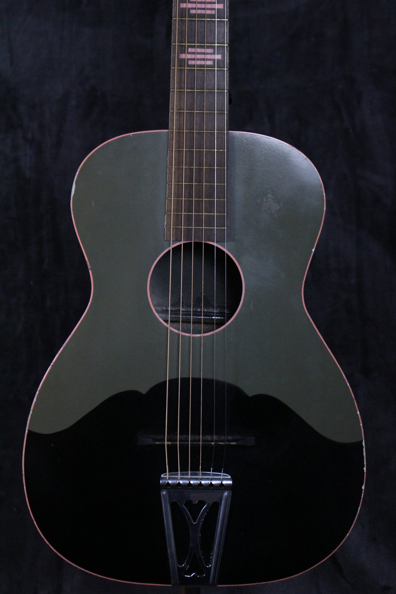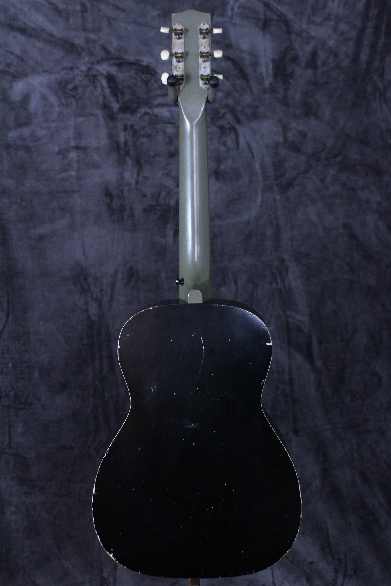 Cosmetics: This guitar is in good condition for its age. The guitar maintains its original 2-tone black and grey finish. It has light surface scratches on the top and back of the body. Some of the bracing has been re-glued and repaired. The back of the neck is clean, and the original frets are tall and show minimal wear. Overall, this guitar plays very well and sounds fantastic.