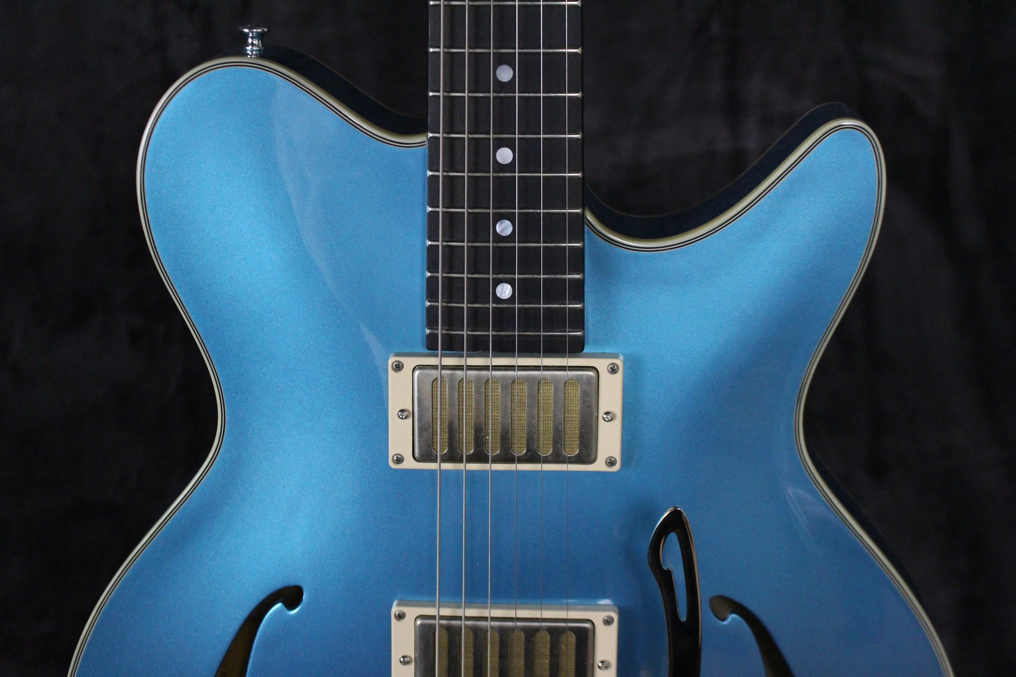 Neck: Maple with a Ebony fingerboard, 12” radius, 24.75” scale length, 1.72” nut width, 22 frets, pearl dot inlays.