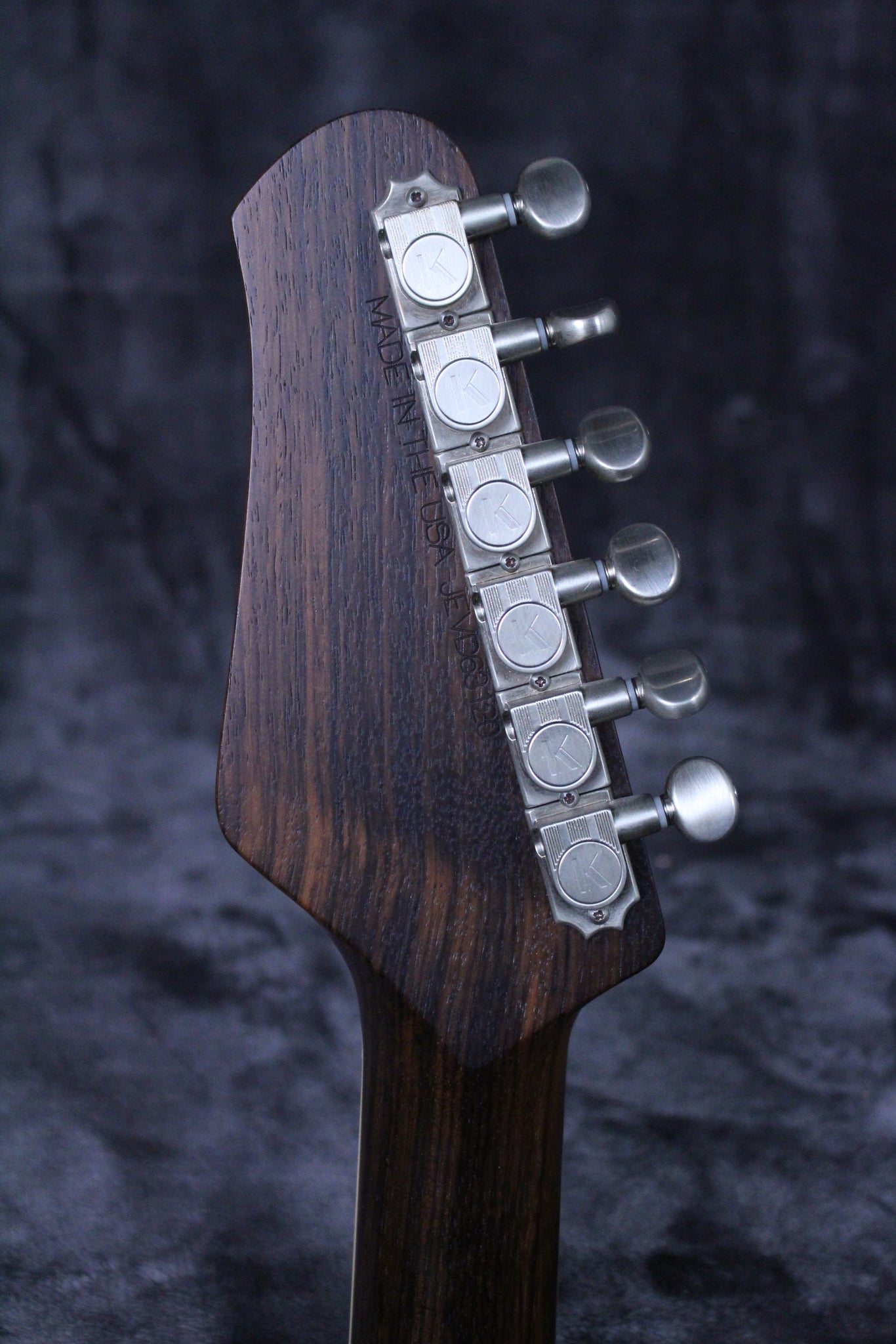 Neck: Solid Rosewood neck with a bound Rosewood fingerboard, 12” radius, 25.5” scale length, 1.650” nut width, 21 frets, Pearl-block inlays.