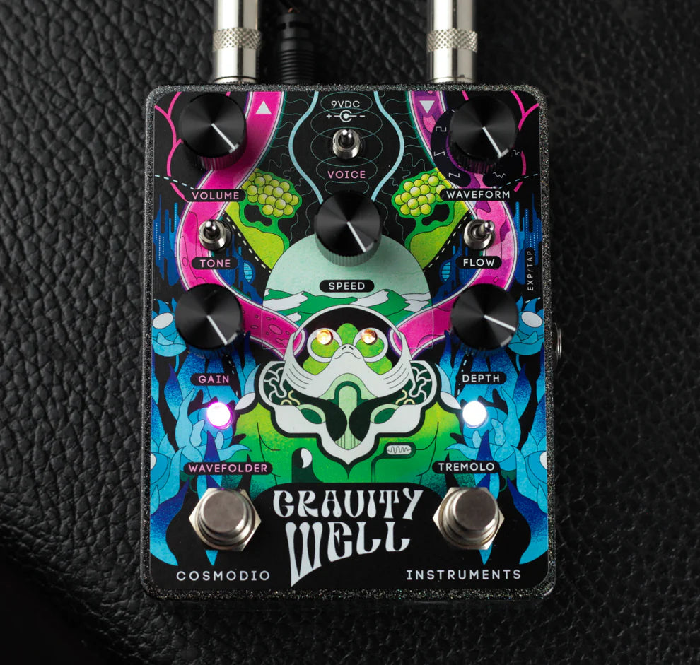 The Gravity Well analog tremolo/wavefolder/refractor is your sonic submersible for exploring subaquatic psychedelic netherworlds of sound. It's a dual pedal featuring a tremolo on one side and a wavefolder on the other. When both sides are active a third effect emerges, a refractor, a first-of-its-kind style of modulation effect produced by integrating the tremolo and wavefolder to rhythmically and fluidly warp and un-warp your signal, producing a dazzling variety of never-before-heard sounds and textures.