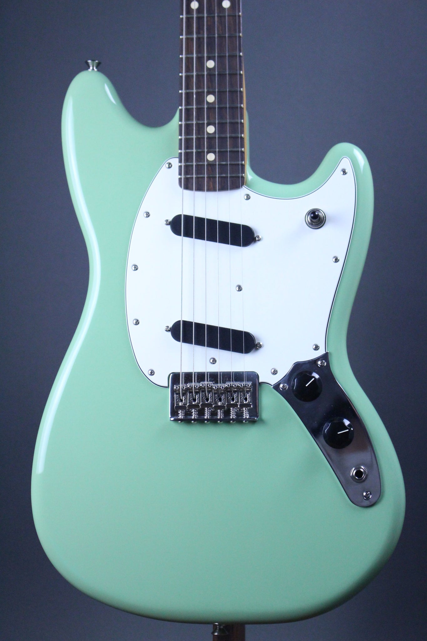 This Fender Player II Mustang is a perfect mix of classic and modern. With a rosewood board, light weight alder body in Birch Green, Player Series Alnico V Mustang pickups, and ClassicGear tuners, this guitar feels and sounds like a vintage Mustang. The Player II Mustang comes stock with a string through bridge instead of a Fender Dynamic Vibrato, as well as a 3-way switch instead of the classic Mustang control layout. The result is a barebones simple instrument, which sounds like a Mustang minus all of the headache.