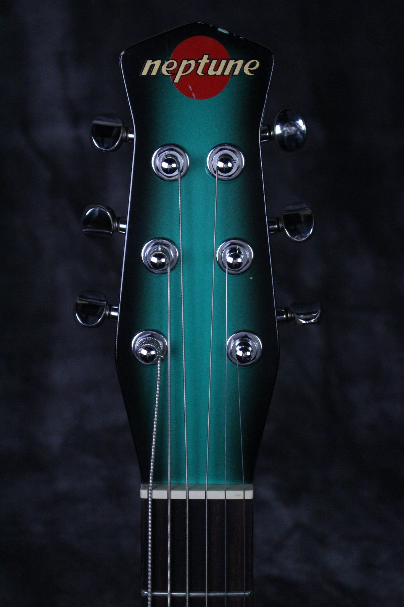 Cosmetics: This rare guitar is in good condition. It has a rare “Teal Burst” finish that we believe is the only Neptune baritone made in this finish. It has light surface scratches on the top and back of the body. The back has some buckle rash with the top having a few small dings in the finish. The back of the neck is clean, and the frets show minimal wear. Overall, this guitar plays very well and sounds fantastic.