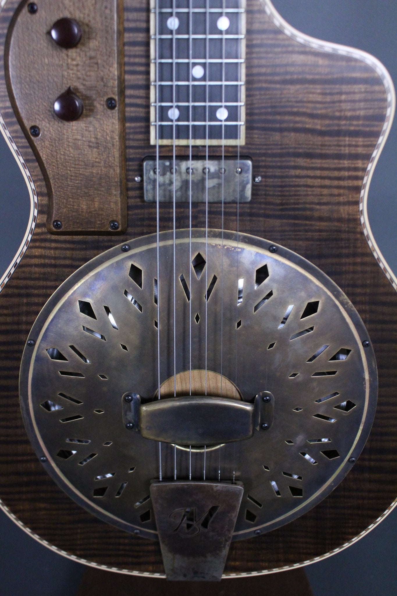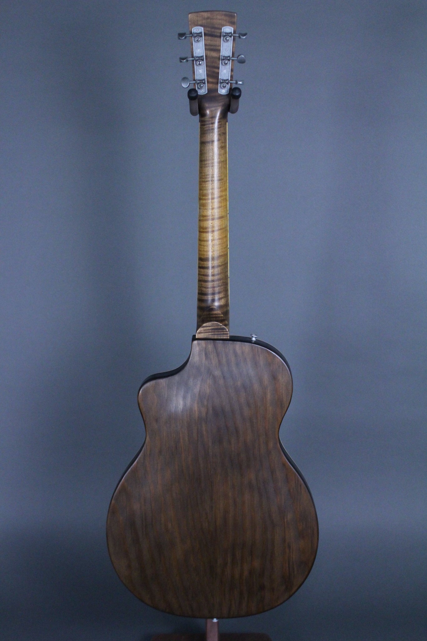Body: Flame Maple top with a cutaway and a carved back in Dark Brown finish.