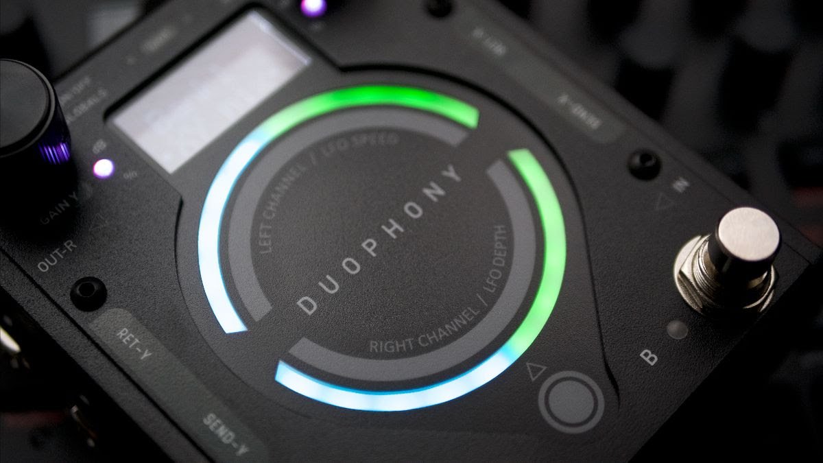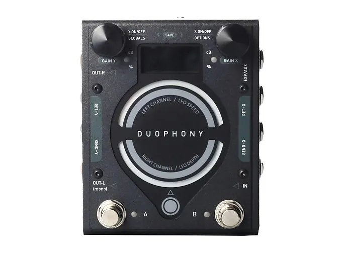 The GFI System Duophony is a mono/stereo parallel blender pedal of unparalleled depth and flexibility, allowing the user to blend two separate signal chains of any kind in myriad different ways.⁣⁣Its rotary touch slider mix control is both intuitive and eye catching, requiring but a swipe of the finger to tweak the blend ratio of Duophony’s X and Y loops.⁣⁣ Each loop is further equipped with dedicated, easily accessible controls, including gain, dry level, phase, trails (for reverbs and delays), and there’s even an onboard modulation engine with its own expansive control set.⁣⁣ Duophony offers three parallel blend modes for its loops, two routing options (parallel or series), and 16 presets organized into eight banks.⁣⁣Besides the touch slider on the face of the pedal, each of Duophony’s knobs is also a button, allowing quick access to any parameter while keeping the user interface clean and simple.⁣⁣ Options for outboard expression, aux switching, and MIDI control round out Duophony’s exhaustive feature set, making it the ultimate effects blending workstation for the dedicated sonic adventurer.⁣