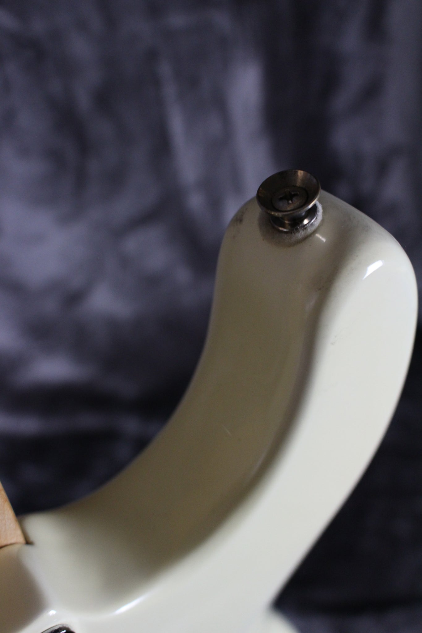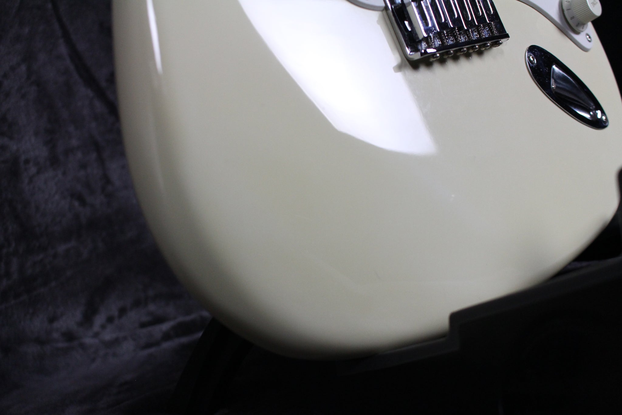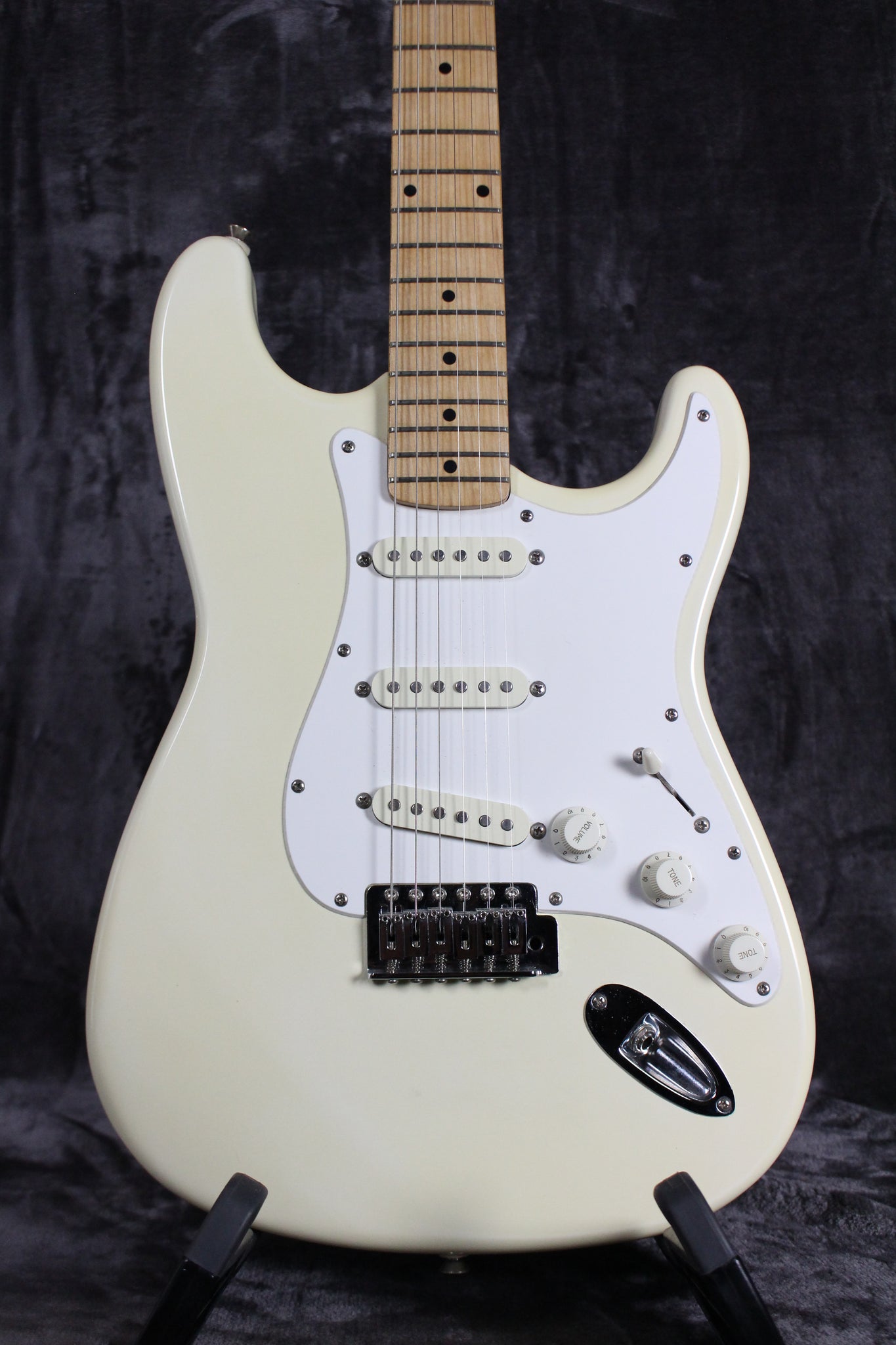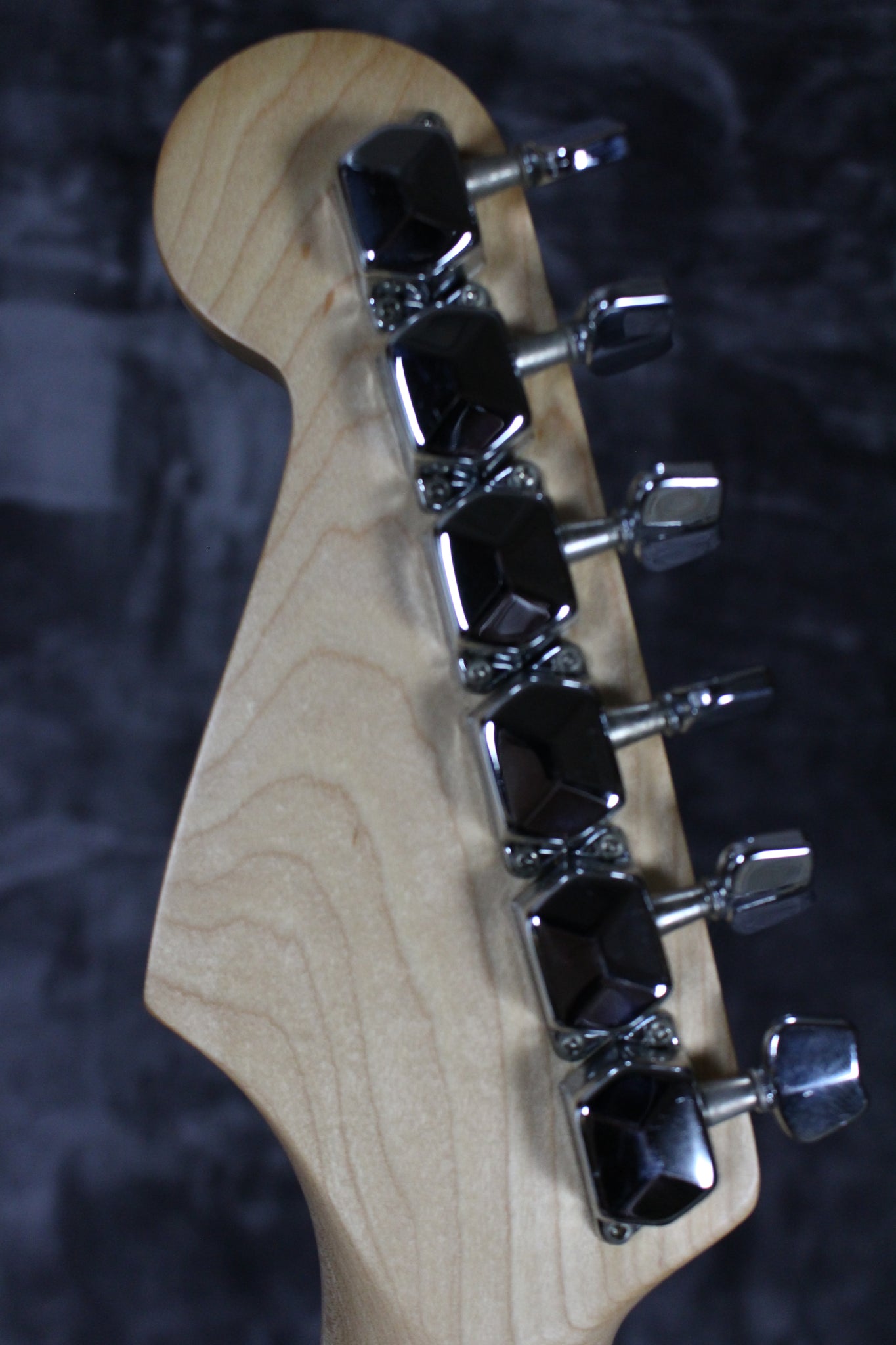 Pickups/Hardware: Three single coil pickups, master volume/two tone controls/5-way pickup selector, closed gear tuning keys, 6-saddle bridge, white single-ply pickguard, cream pickup covers/control knobs.