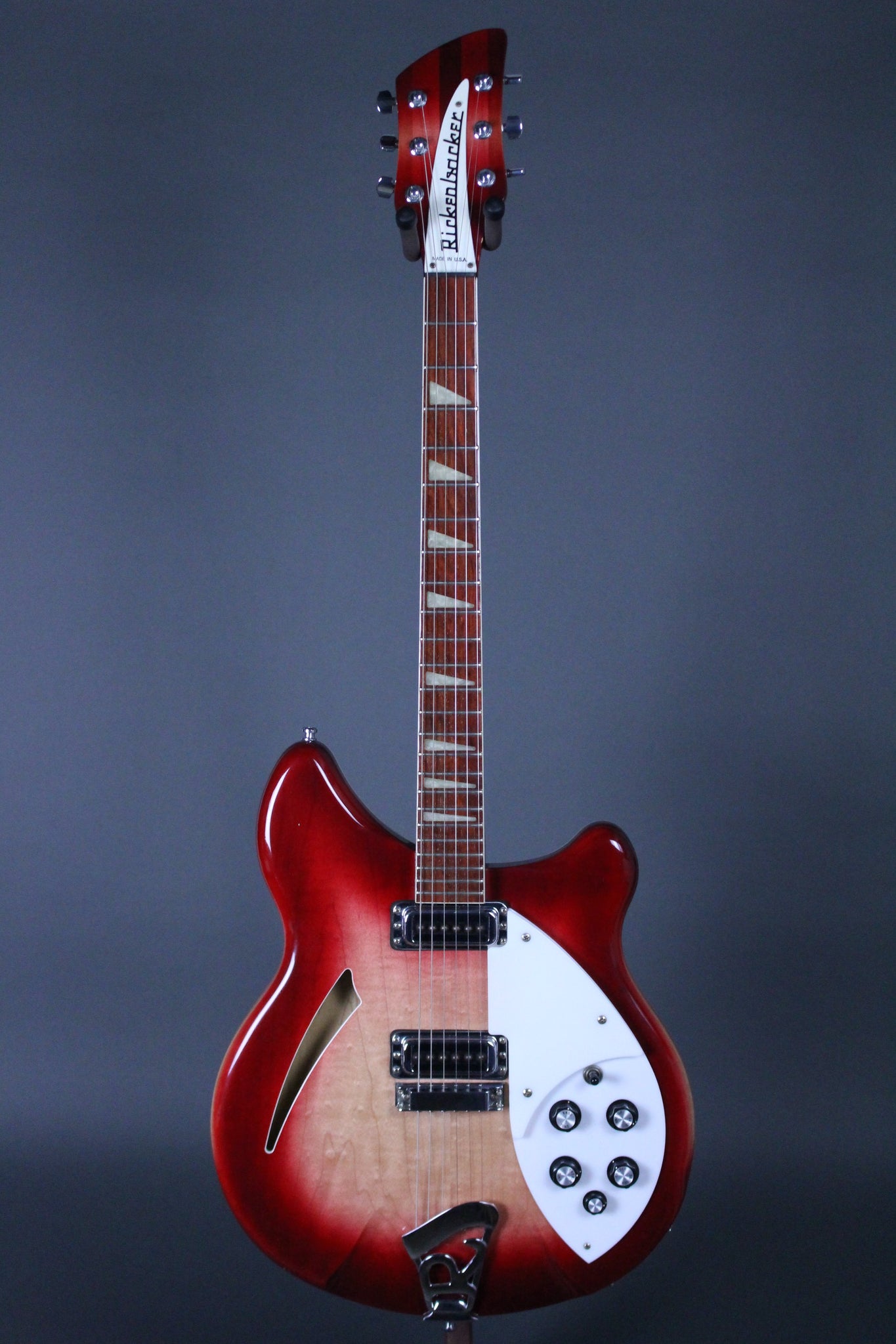 Pickups/Hardware: Factory Rickenbacker “high-gain” pickups, Schaller tuning keys, 6-saddle bridge with “R” tailpiece, Rick-O-Sound outputs, volume and tone knobs for each pickup with pickup blend knob, graph-tech nut.
