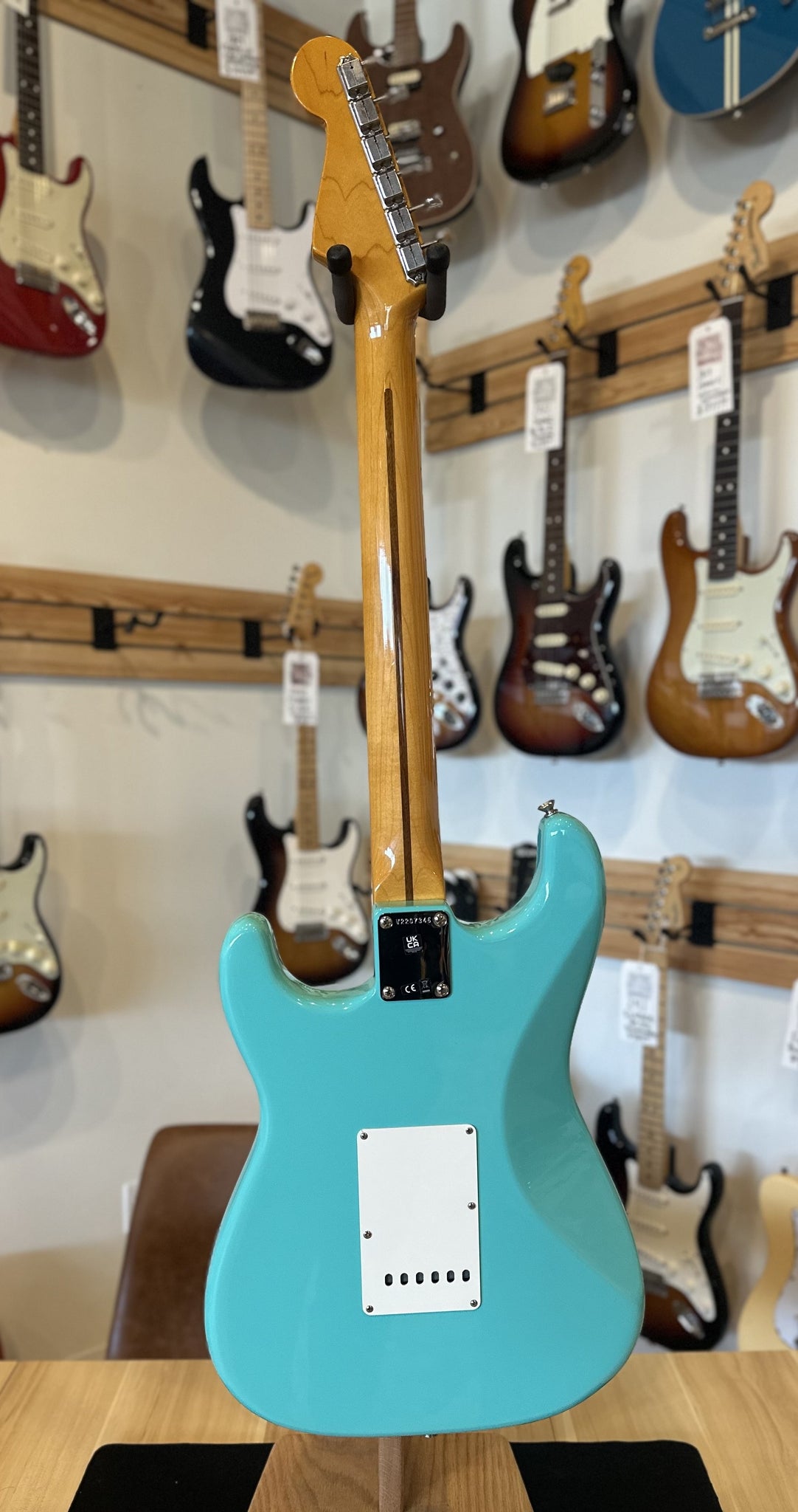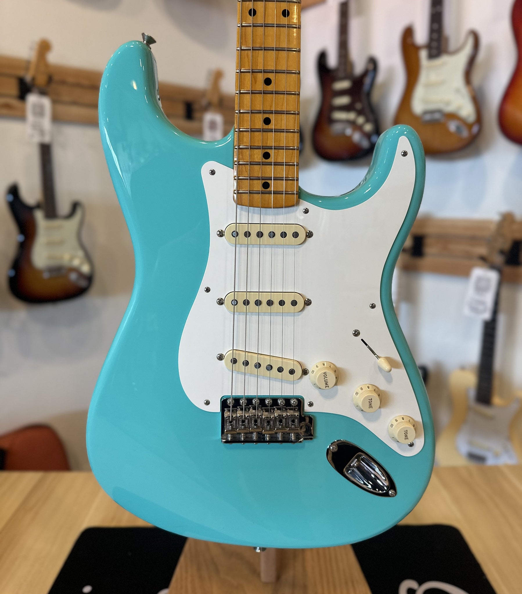 Neck: Maple with a Maple fingerboard, 25.5” scale length, 1.650” nut width, 7.25” radius, 21 frets, 1957 soft “V” profile.