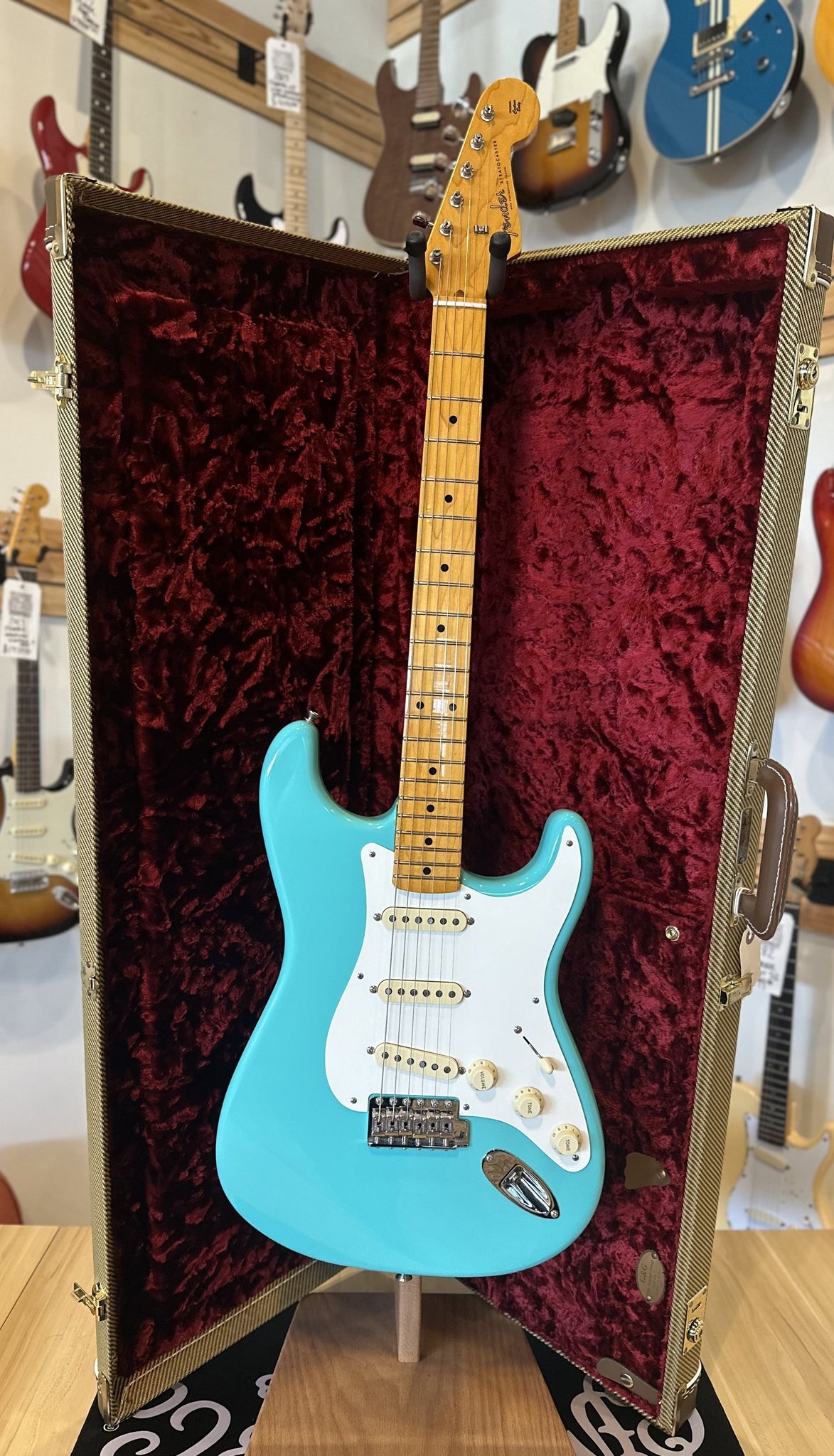 Pickups/Hardware: Three Pure Vintage ’57 Stratocaster single coil pickups, vintage tall frets, single ply pickguard, vintage style tuning keys, bone nut, master volume/2x tone controls/5-way pickup selector.