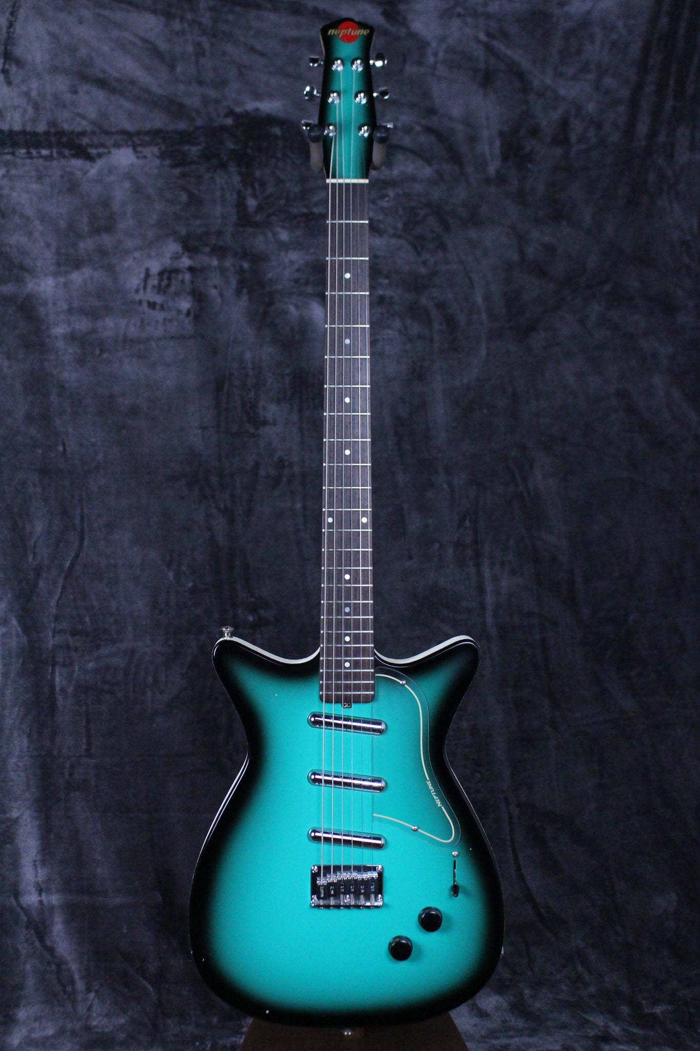 Cosmetics: This rare guitar is in good condition. It has a rare “Teal Burst” finish that we believe is the only Neptune baritone made in this finish. It has light surface scratches on the top and back of the body. The back has some buckle rash with the top having a few small dings in the finish. The back of the neck is clean, and the frets show minimal wear. Overall, this guitar plays very well and sounds fantastic.