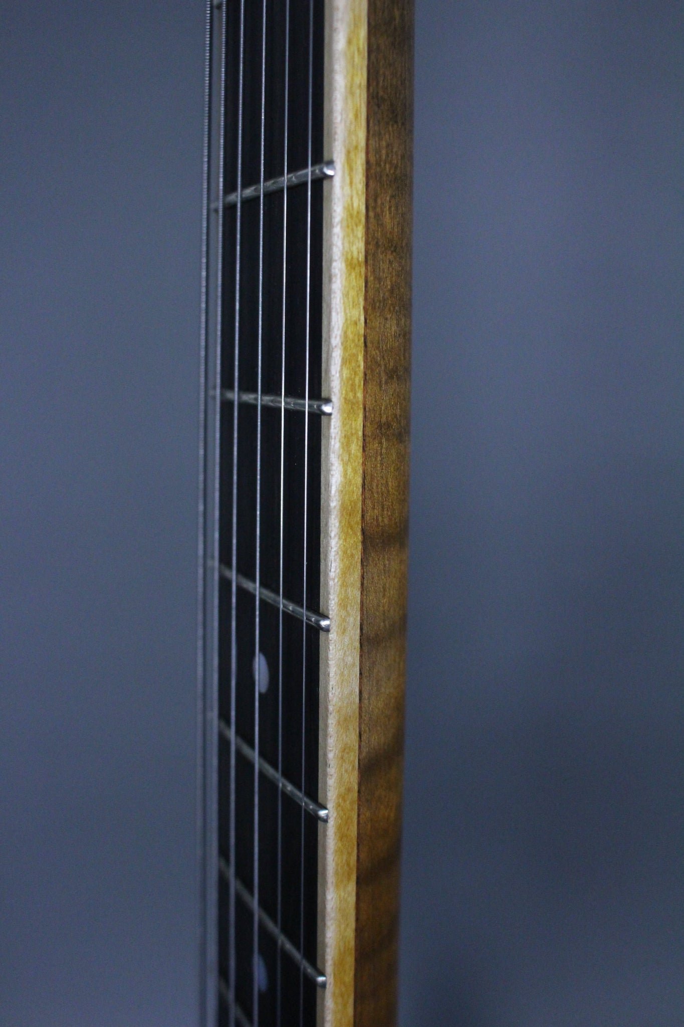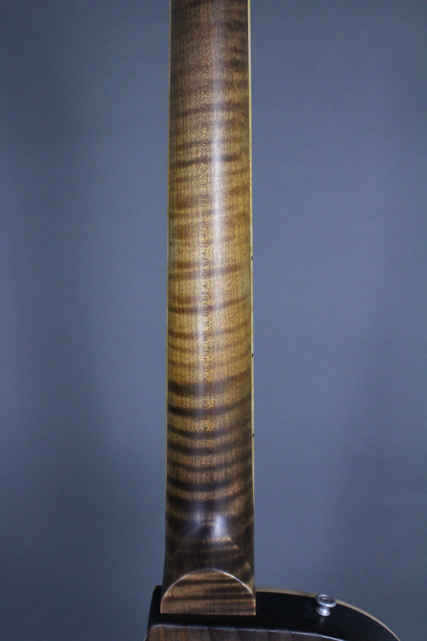 Neck: Flame Maple neck with a Ebony fingerboard, 25.5” scale length, 1 3/4” nut width, 21 frets, pearl-dot inlays.