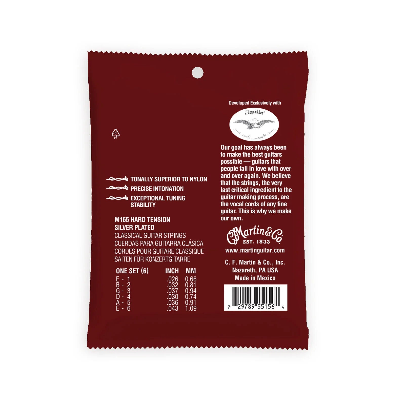 Martin’s premium classical strings are tonally superior to nylon. The proprietary synthetic material emulates gut strings that have been around for centuries. Magnifico® strings, developed exclusively with Aquila, offer precise intonation and exceptional tuning stability. All Nazareth-made nylon guitars and custom produced nylon guitars are strung with Martin’s Magnifico premium classical strings. Unlike Martin’s standard classical strings, which have a ball-end, Magnifico classical strings will be offered only with the traditional tie-end.