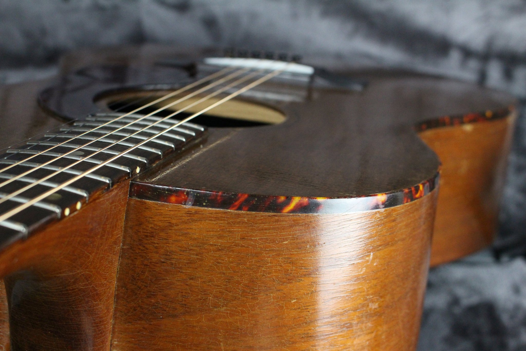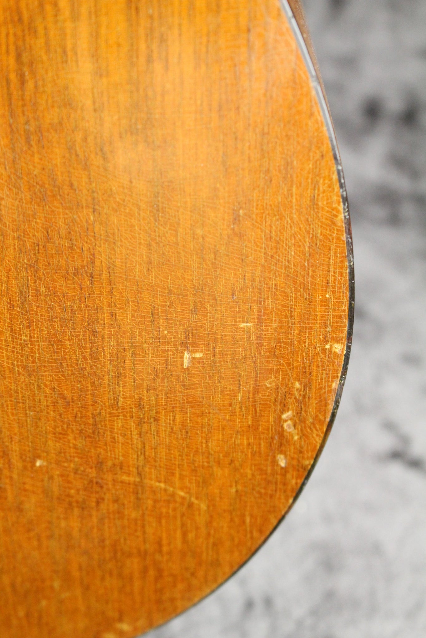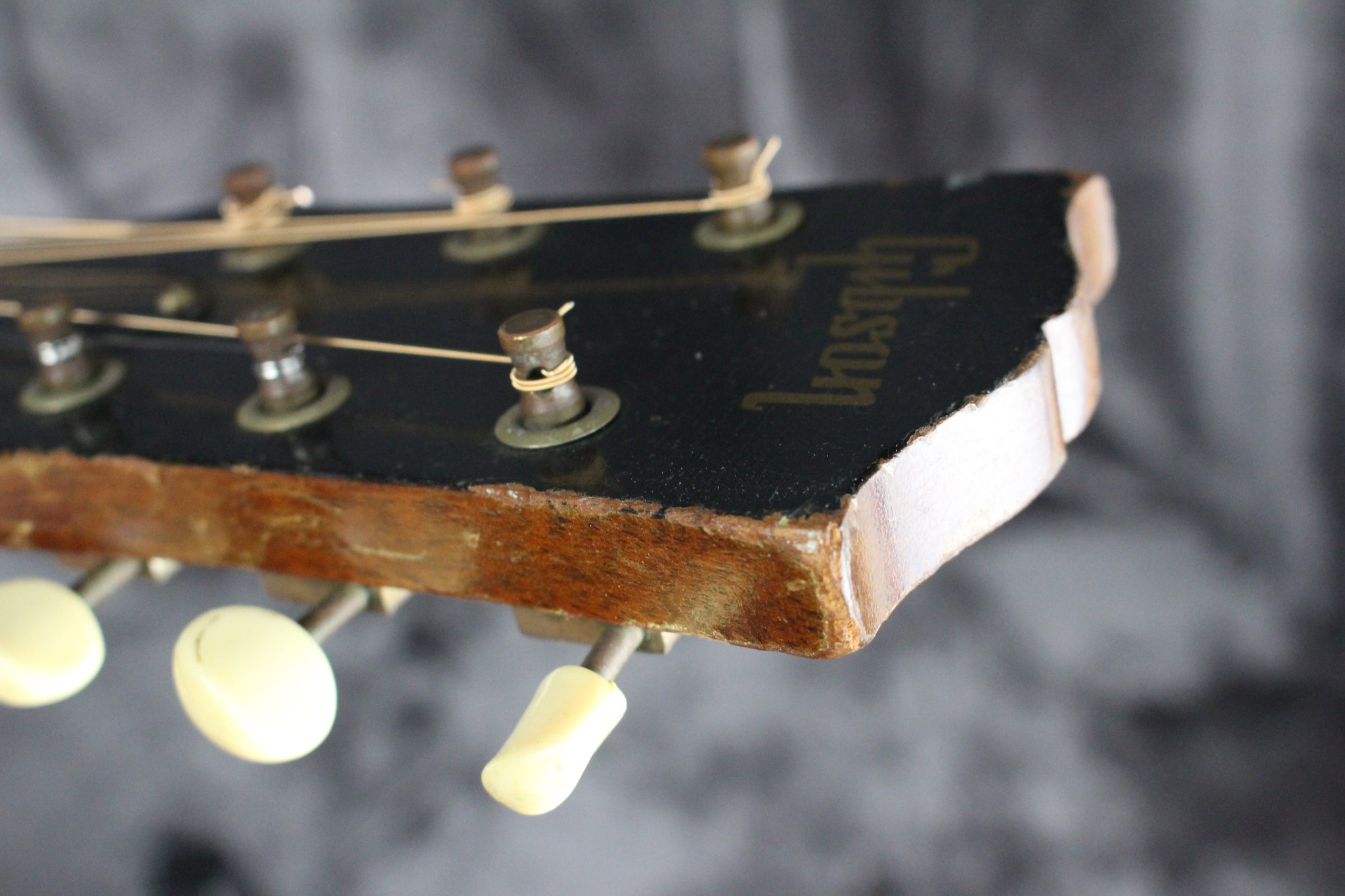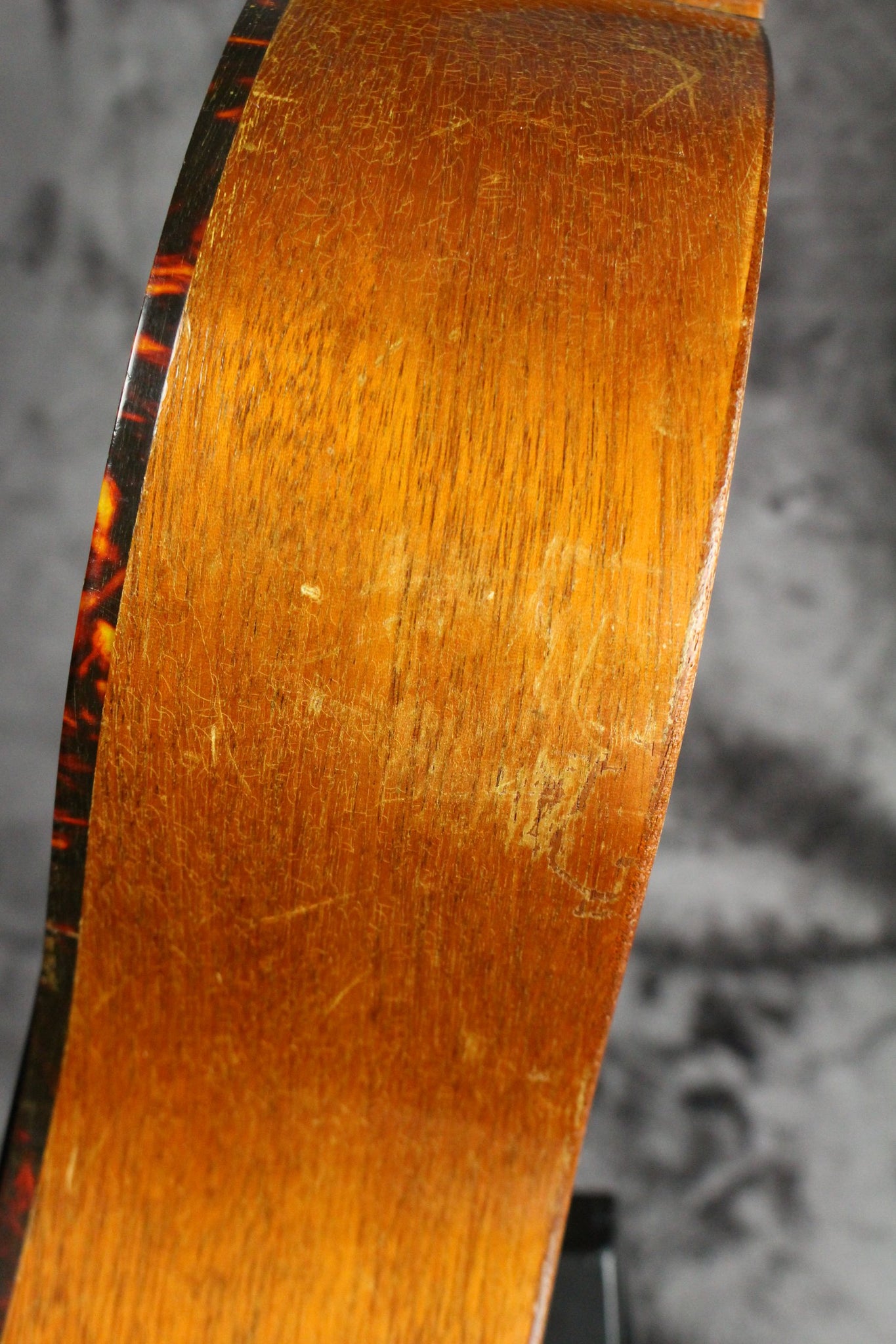 Cosmetics: This guitar has a slight bridge lift. There is noticeable wear on the headstock. It has tons of beautiful finish checking. This guitar has various nicks, dings, and scratches throughout. It appears that someone has refretted this guitar as well. The G string tuning key is slightly bent but still works properly. Overall, this guitar plays very well and sounds great.