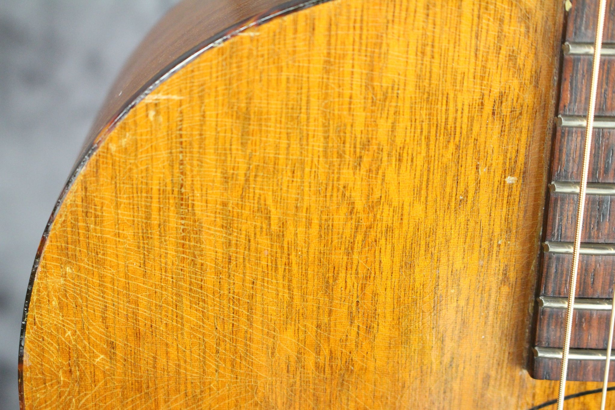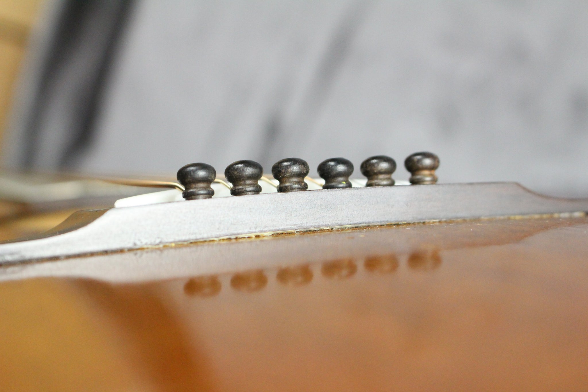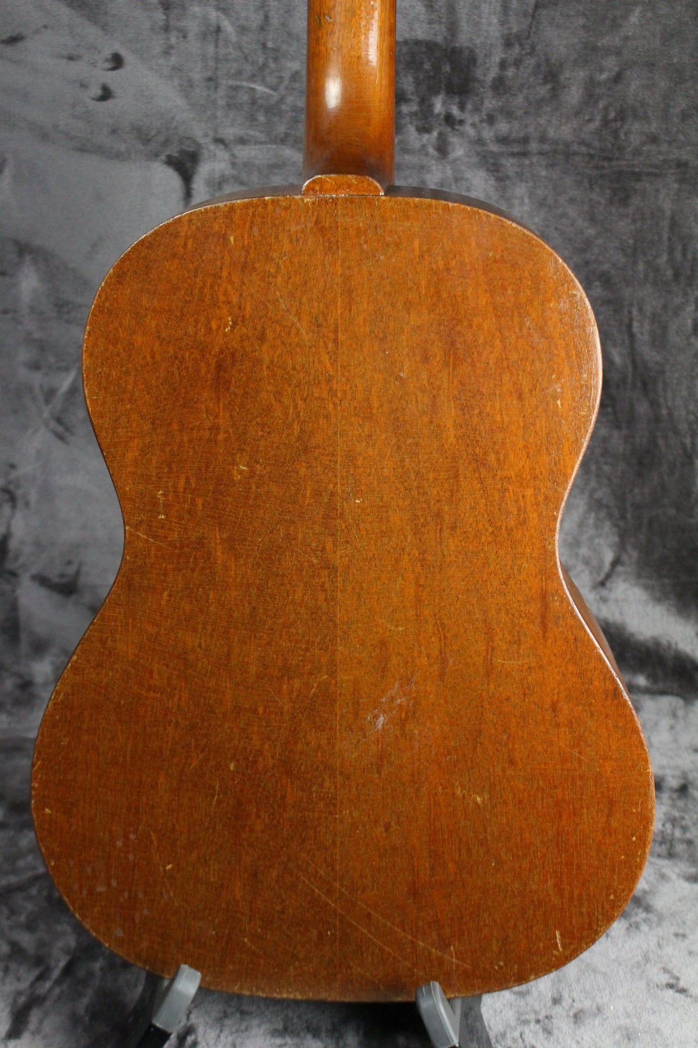 Cosmetics: This guitar has a slight bridge lift. There is noticeable wear on the headstock. It has tons of beautiful finish checking. This guitar has various nicks, dings, and scratches throughout. It appears that someone has refretted this guitar as well. The G string tuning key is slightly bent but still works properly. Overall, this guitar plays very well and sounds great.